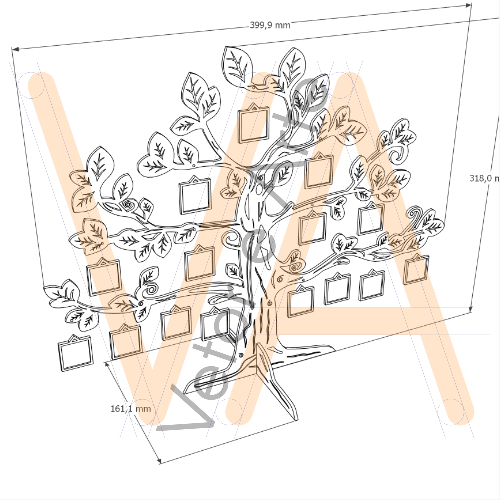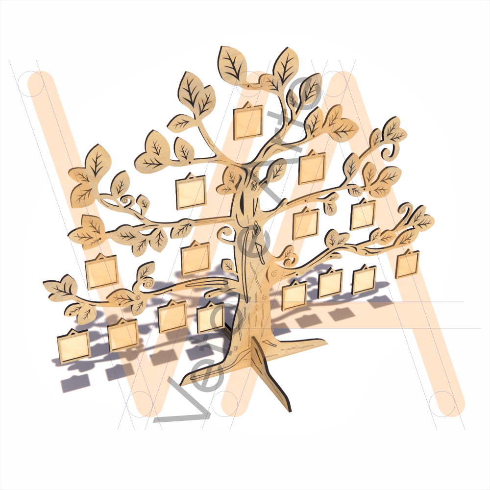 Vetor para fabricação de Árvore Genealógica de mesa com molduras integradas para fotos ou nomes. O projeto apresenta design orgânico com encaixes precisos na base, ideal para produção em MDF via corte a Laser, atendendo perfeitamente nichos de presentes personalizados e datas comemorativas.
